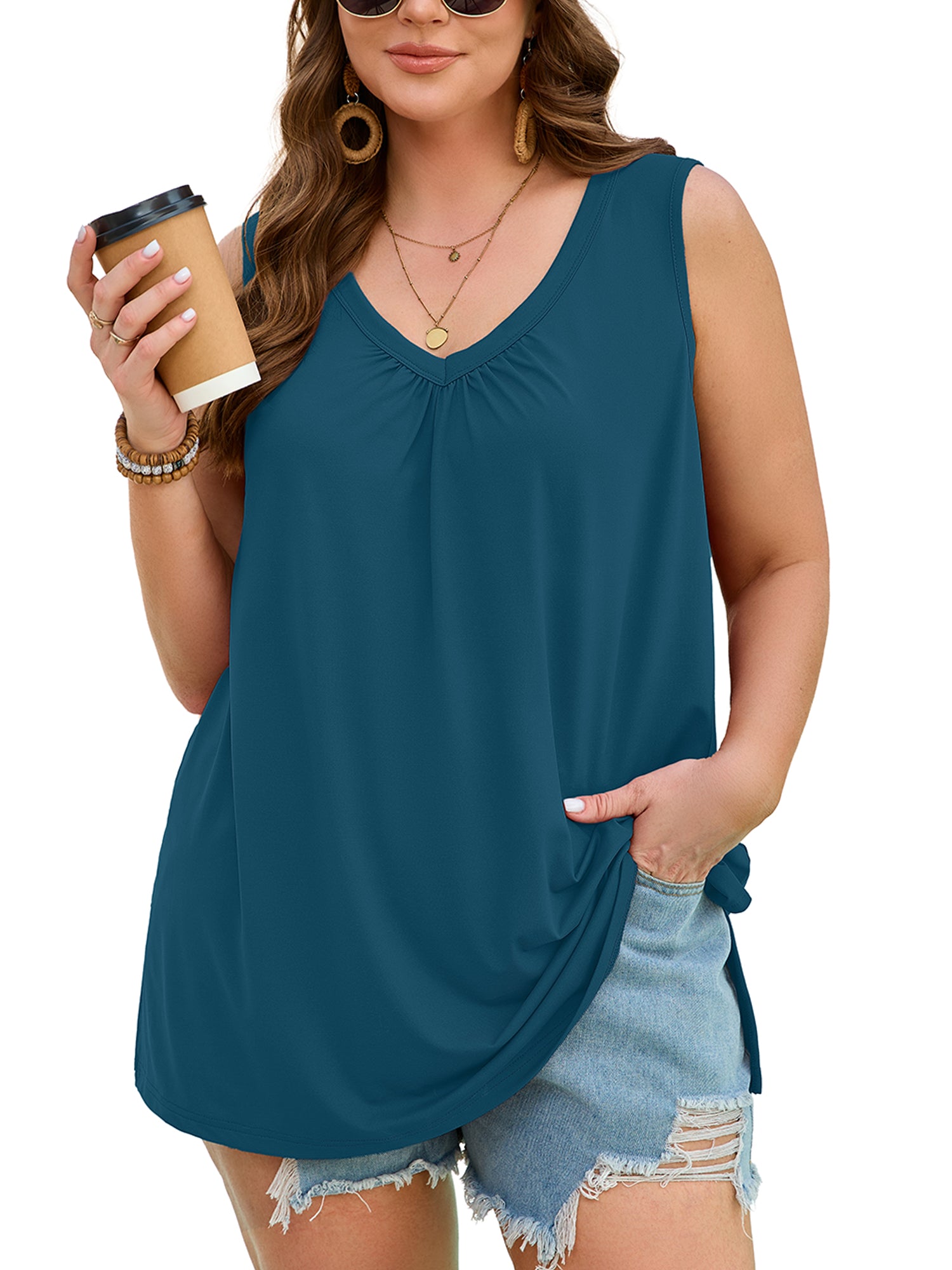 Stay cool and chic all summer long with SHOWMALL’s plus-size sleeveless tank top. Designed specifically for curvy silhouettes, this top is crafted from a premium blend of 95% Polyester and 5% Spandex, offering a buttery-soft touch and exceptional breathability. The elegant V-neckline is enhanced with delicate pleated details to add a touch of sophistication, while the side slits on both sides ensure a relaxed fit and freedom of movement around the hips. Whether you're layering it under a blazer for the office or pairing it with denim shorts for a beach day, this versatile flowy top is a must-have staple for your casual wardrobe.