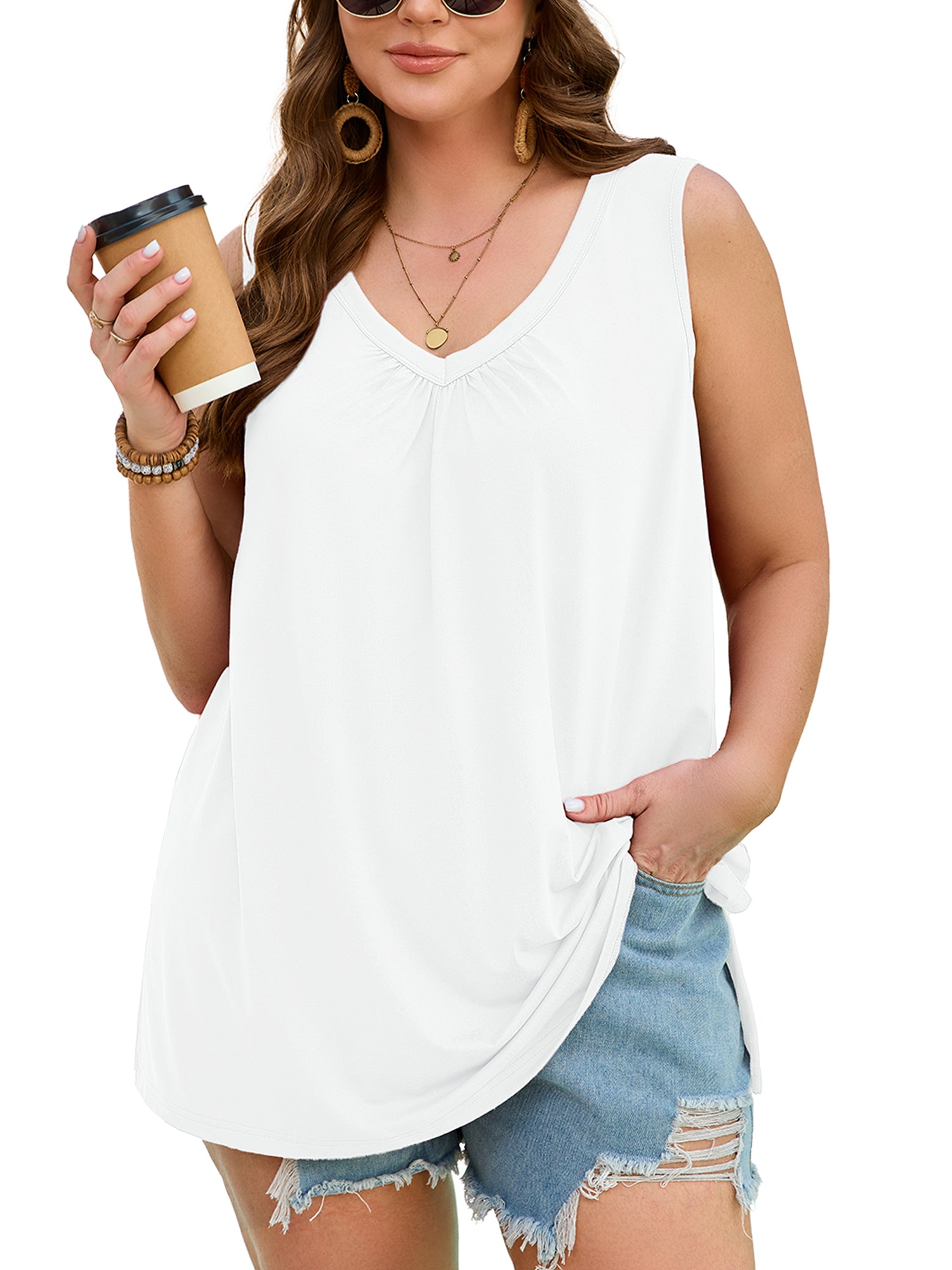 SHOWMALL Women's Plus Size Tank Top, V Neck Pleated Sleeveless Summer Beach Tops, Side Slit Casual Daily Tunic Layering Shirt for Work