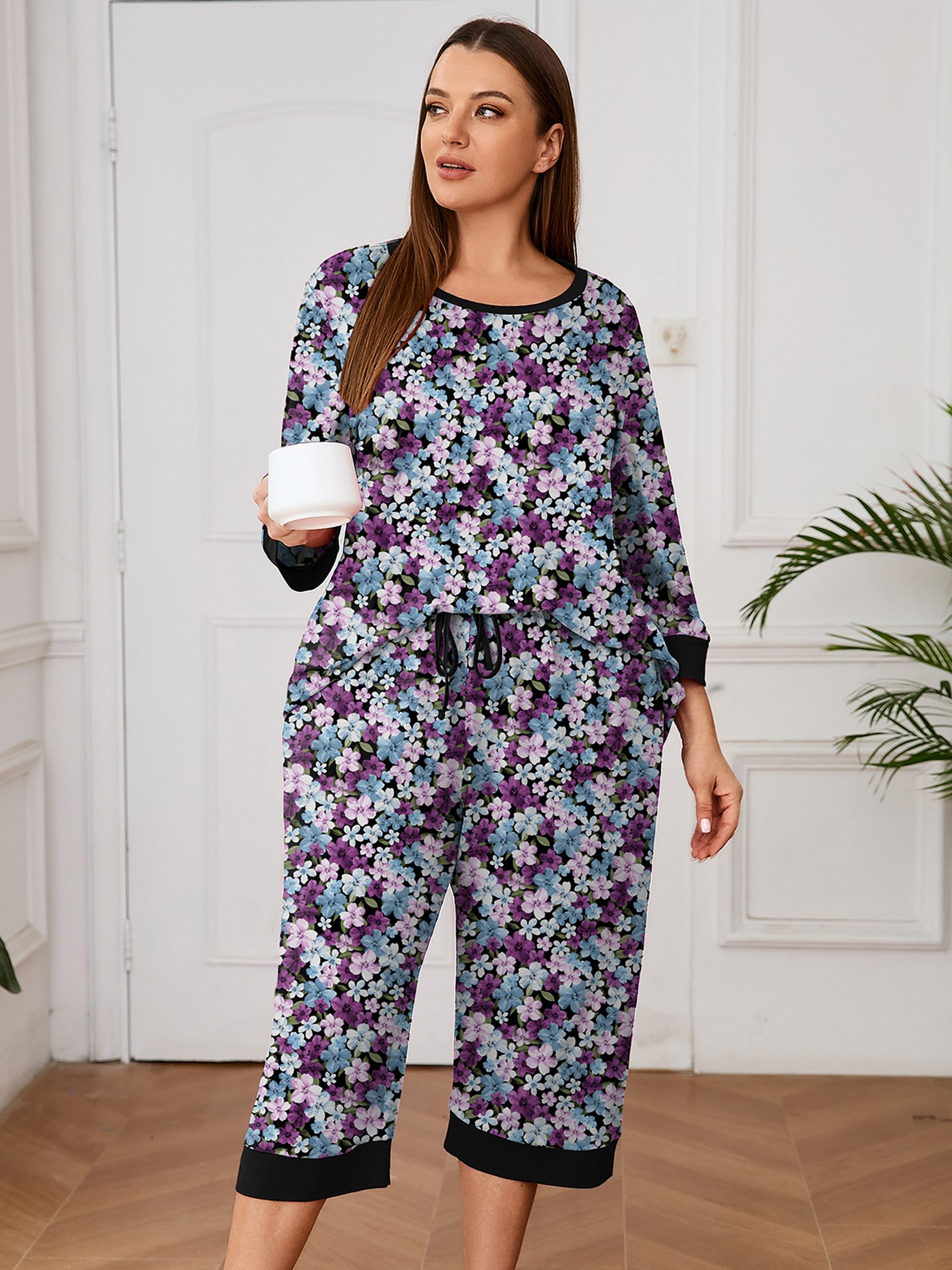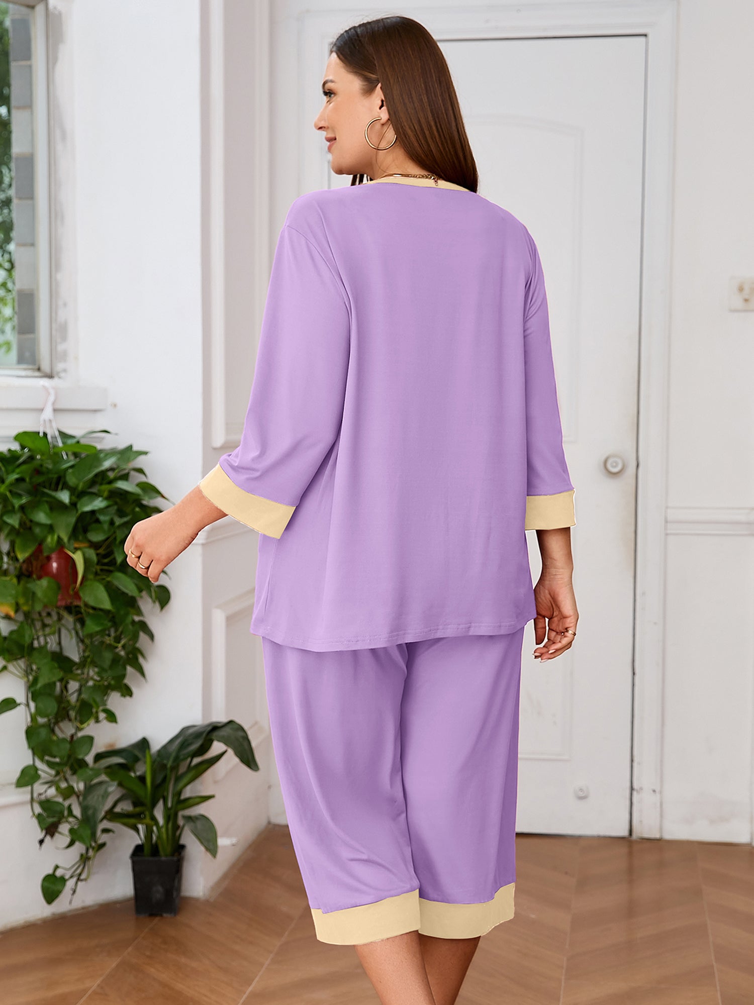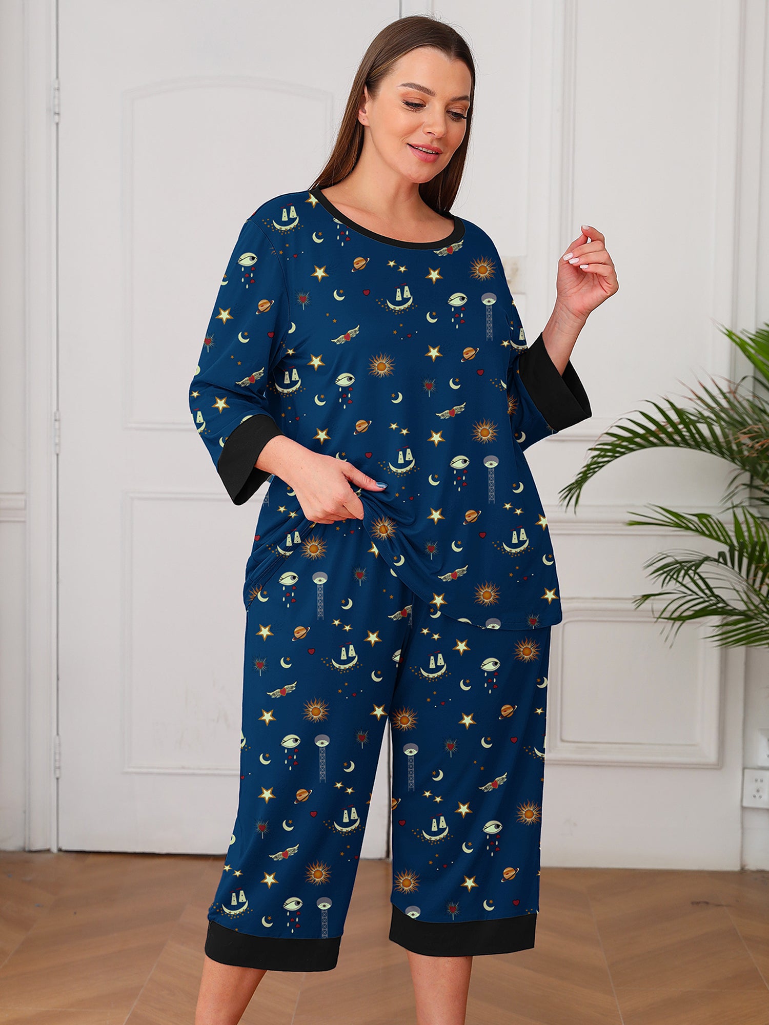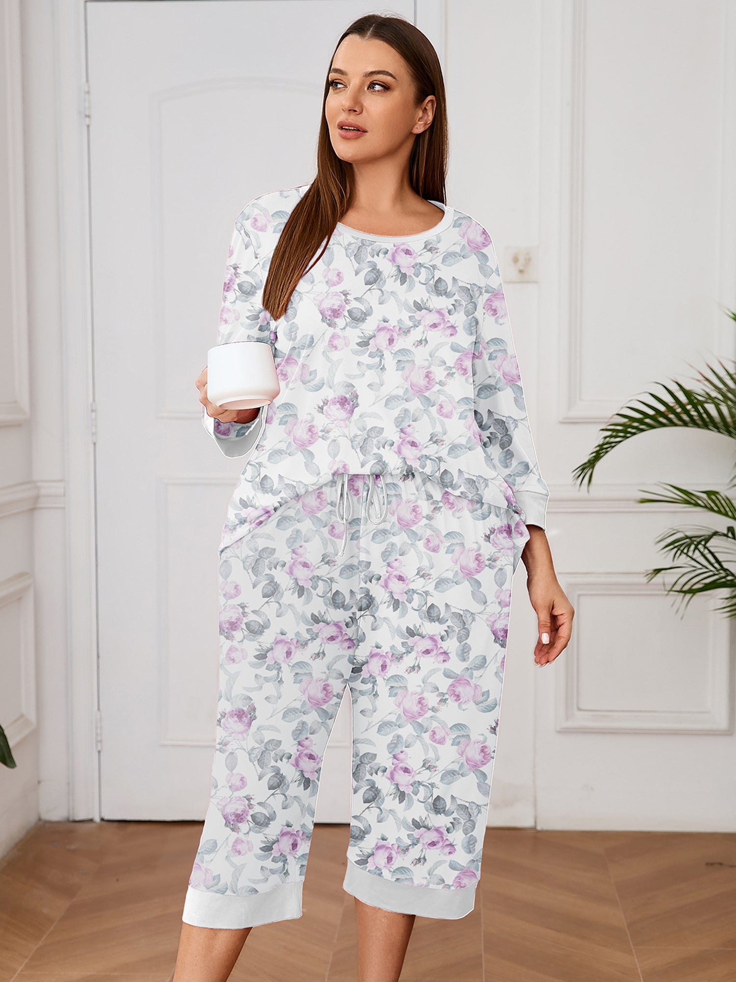 Plus 2 Piece PJS Soft Sleepwear 3/4 Sleeve Top and Waisted Adjustable Capri Pants