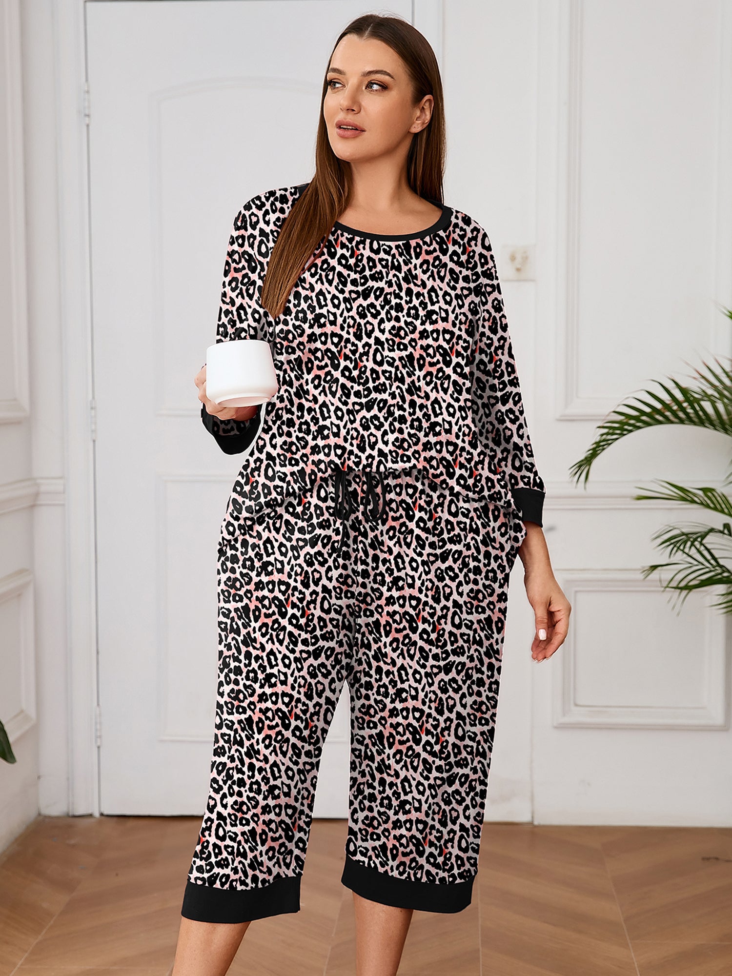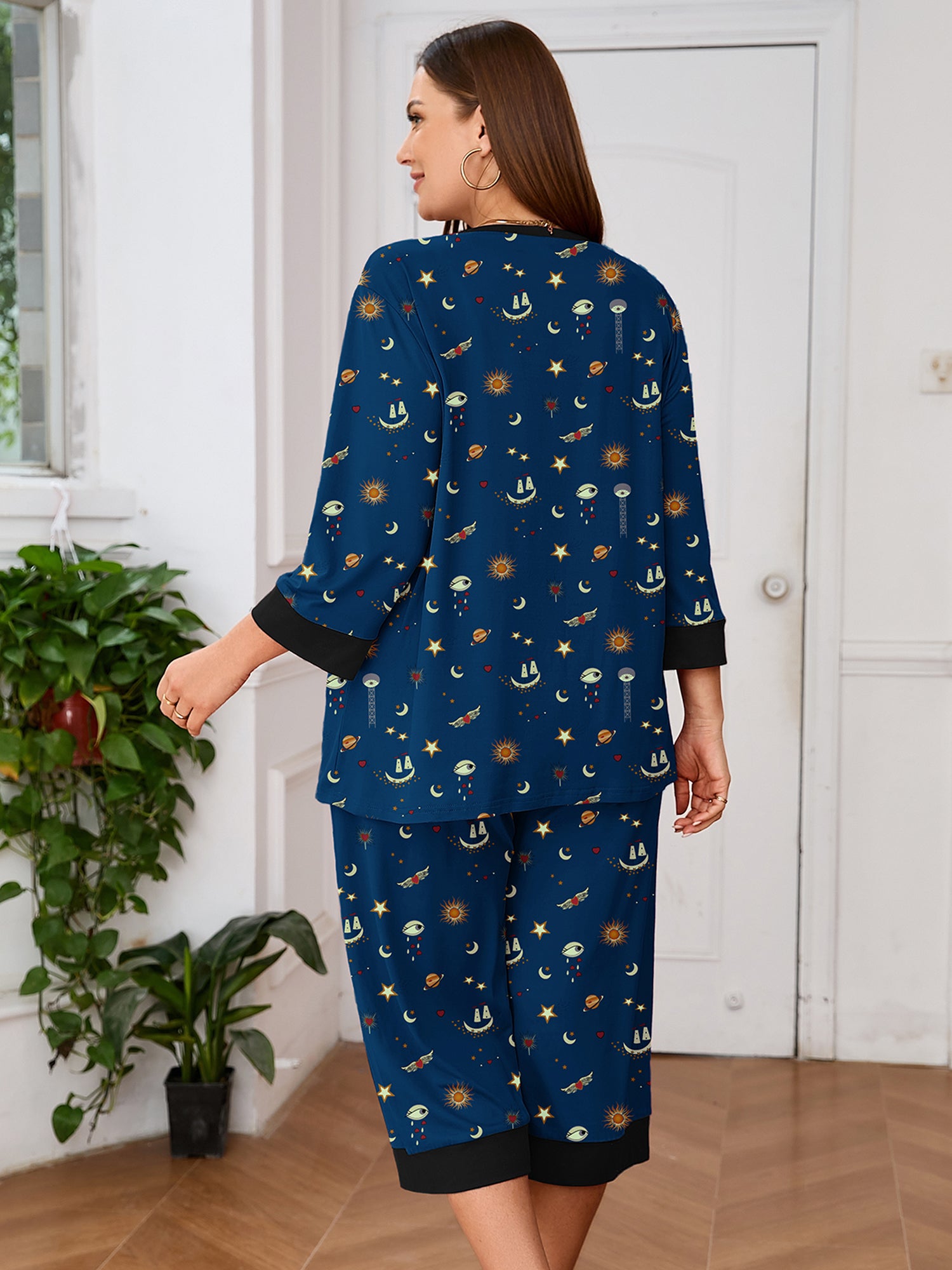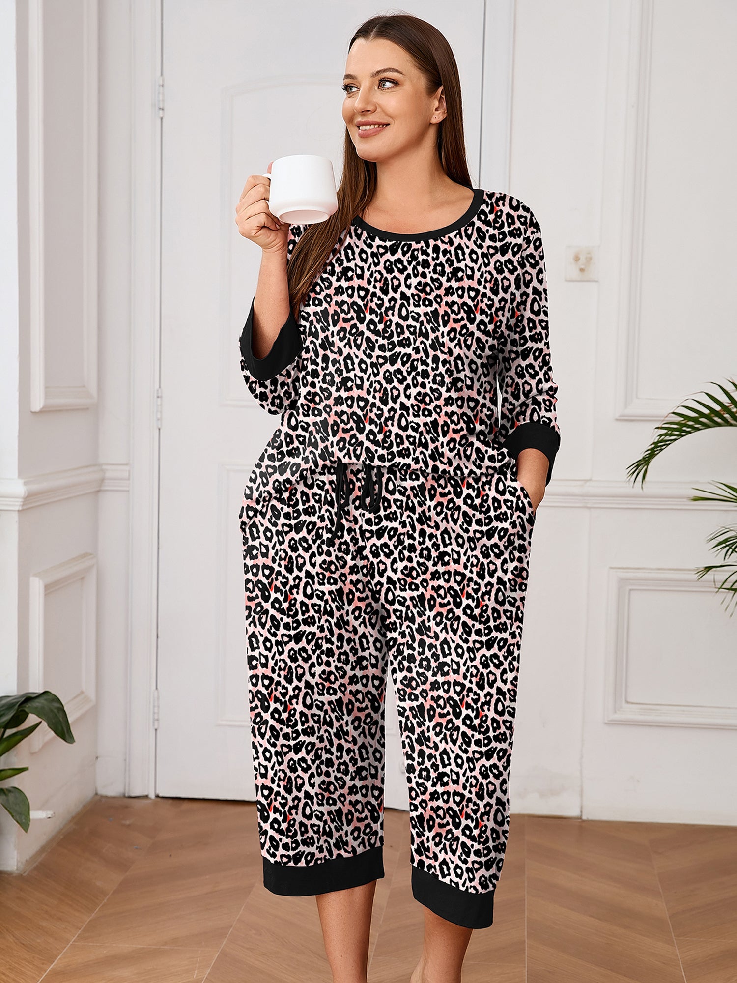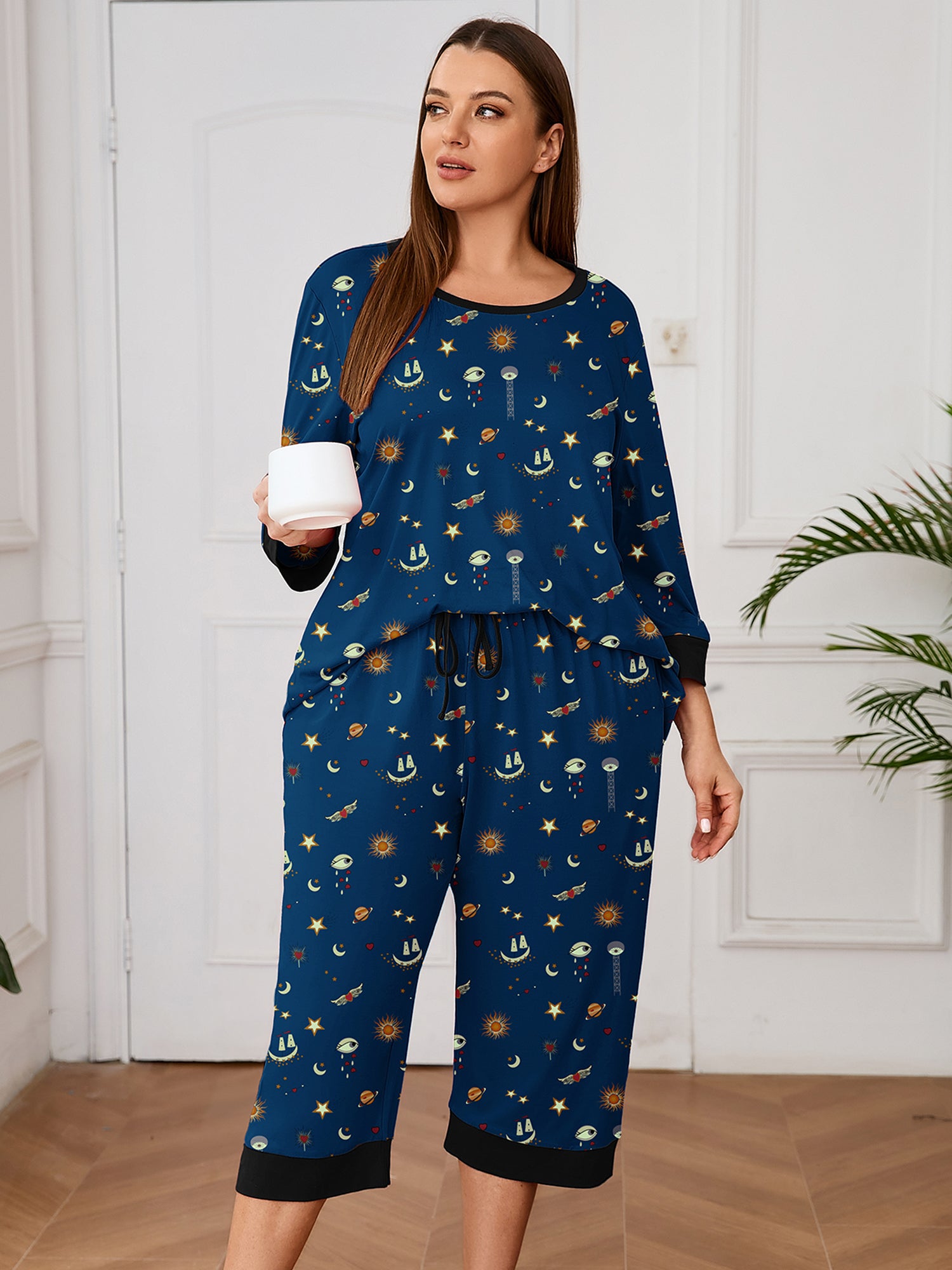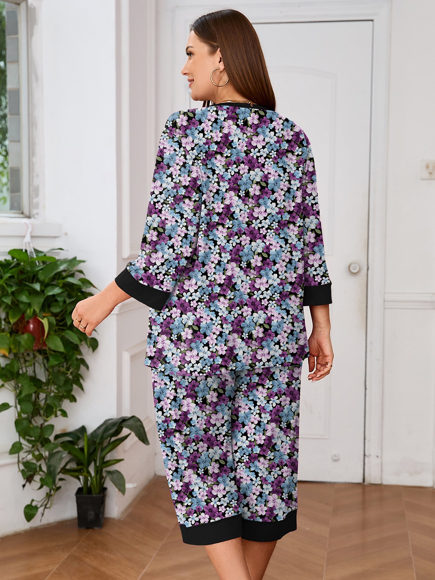 Plus 2 Piece PJS Soft Sleepwear 3/4 Sleeve Top and Waisted Adjustable Capri Pants