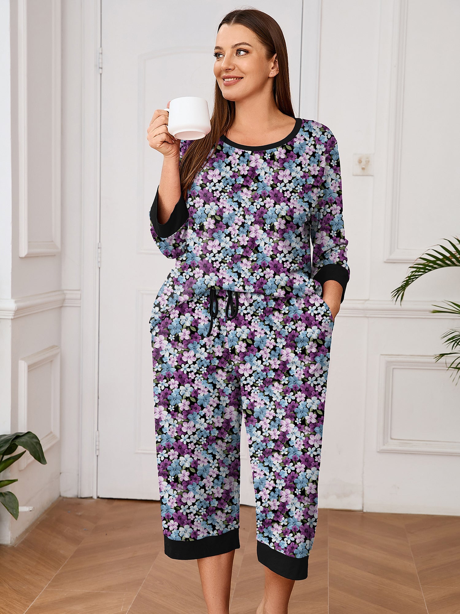 Comfort and style come together perfectly with this pjs that has contrast color trimmed at the neckline, cuff. Each sleepwear set includes a 3/4-sleeved crew neck pullover and a pair of capri pants for comfort. And the pant is designed with an elastic waistband and 2 pockets.